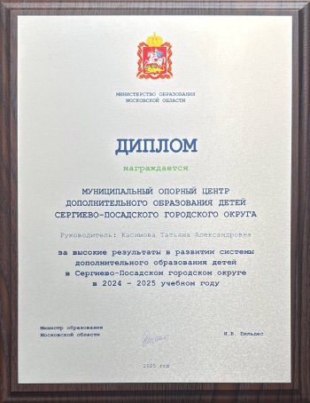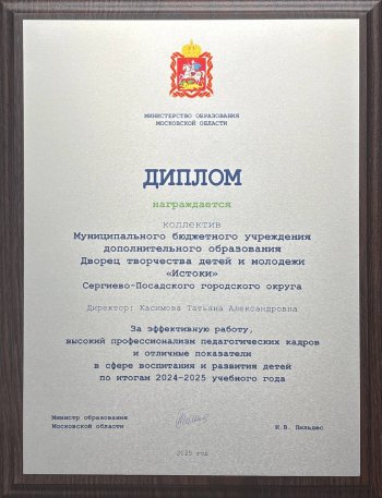 На базе Национального центра «Россия» состоялось совещание «Дополнительное образование детей в Подмосковье: традиции и инновации». Организаторами выступили Министерство образования Московской области и Областной центр развития дополнительного образования и патриотического воспитания детей и молодёжи. На повестке обсуждались ключевые направления системы дополнительного образования в Московской области до 2030 года, концепция развития научно-естественного, технического, спортивного, патриотического направлений. Дворец творчества детей и молодёжи «Истоки» по результатам рейтингования эффективности деятельности муниципальных организаций дополнительного образования сферы образования Московской области по итогам 2024 – 2025 учебного года стал победителем и был отмечен дипломом Министерства образования МО за высокий профессионализм педагогических кадров и отличные показатели в сфере воспитания и развития детей. Муниципальный опорный центр дополнительного образования детей Сергиево – Посадского городского округа также был отмечен дипломом Министерства образования МО за высокие результаты в развитии системы дополнительного образования детей Сергиево – Посадского городского округа в 2024 – 2025 учебном году.